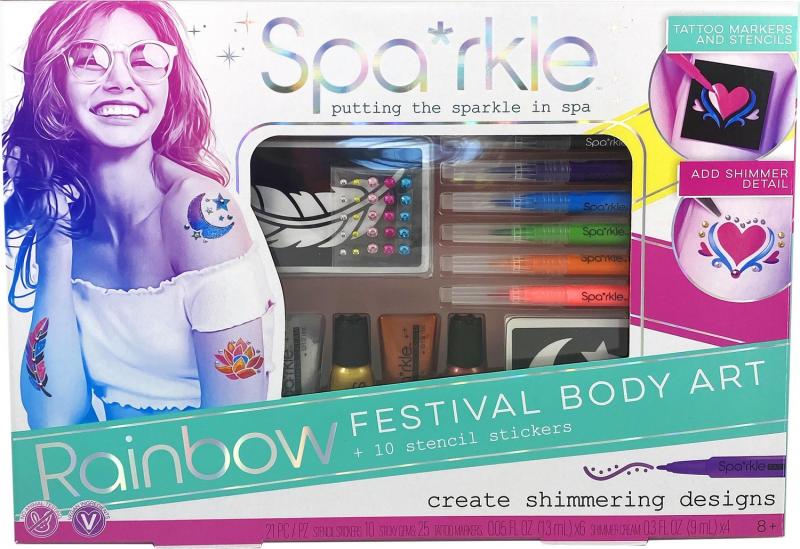 Incluye: 6 marcadores de tatuajes de colores del arcoiris, 4 colores de crema brillante, 10 pegatinas de plantilla reutilizables, 25 gemas adhesivas e instrucciones.